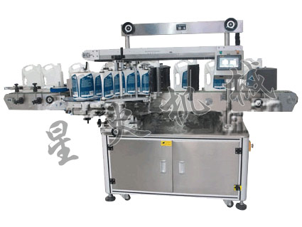 全自动双侧面贴标机(XH-T-71200)适用于圆瓶、方瓶、扁瓶的单面和双侧面贴标,如日常生活中洗发水扁瓶、洗衣液扁瓶、润滑油扁瓶、洗手液圆瓶、消毒液圆瓶等双侧面贴标,两面同贴,双侧面贴提高企业生产效率,广泛应用于日化、石化、医药等行业。